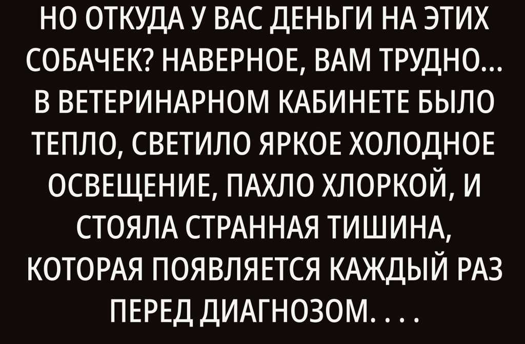 В ветеринарном кабинете было тепло, светило яркое холодное освещение, пахло хлоркой, и стояла странная тишина, которая появляется каждый раз перед диагнозом.