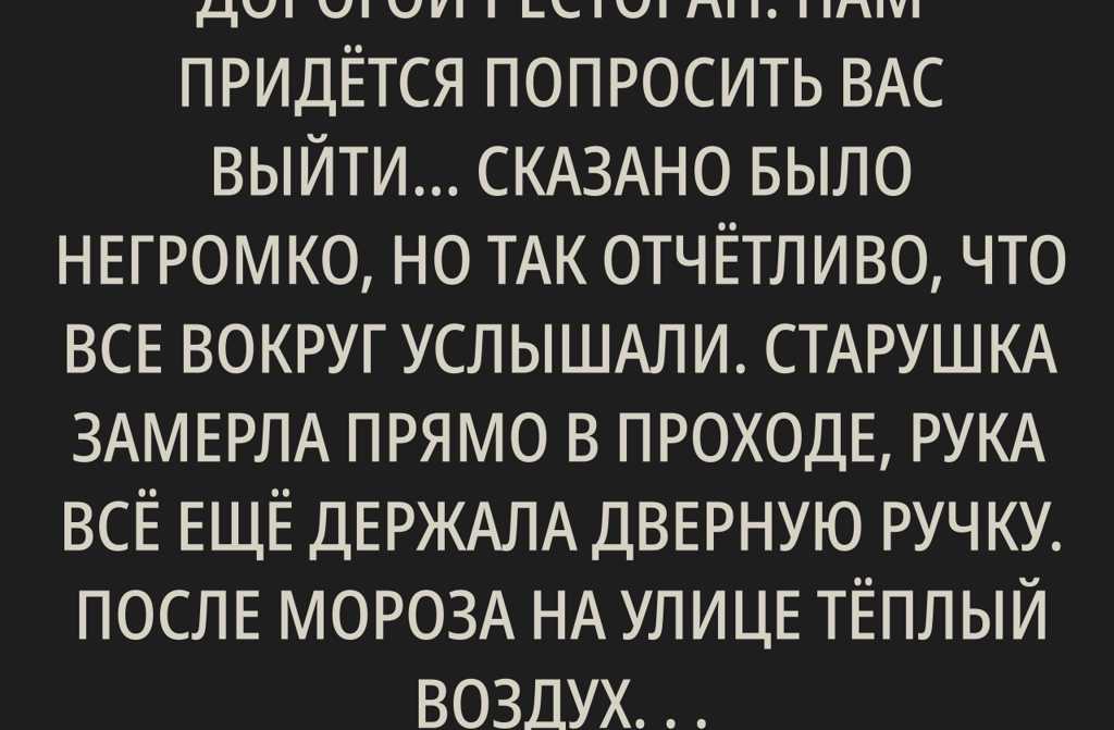 Бабушка, здесь элитный ресторан. Придётся попросить вас выйти…» Фраза была сказана тихо, но чётко. Д…