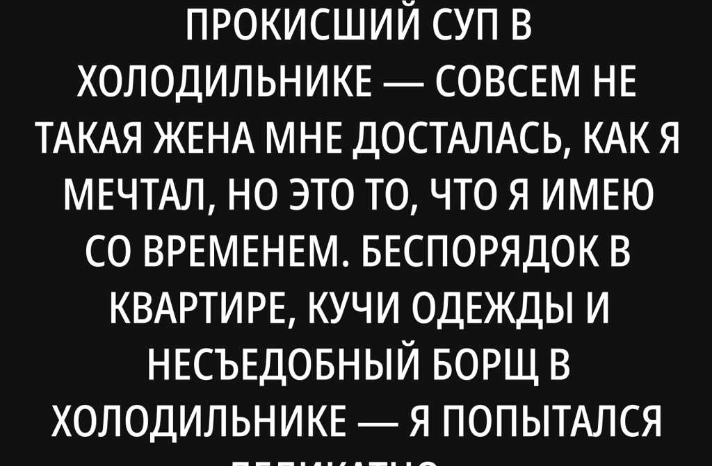 Бардак в шкафу, горы неглаженого белья и прокисший суп в холодильнике совсем не такая жена мне досталась, как я мечтал, но это то, что я имею со временем.