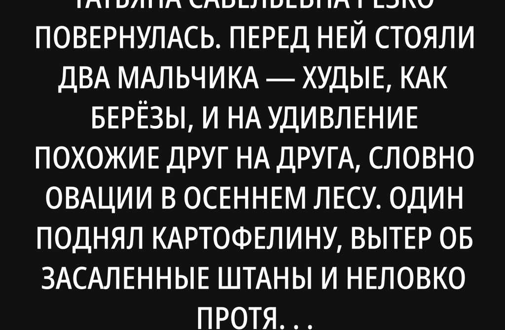 Татьяна Савельевна резко повернулась. Перед ней стояли два мальчика худые, как берёзы, и на удивление похожие друг на друга, словно овации в осеннем лесу. Один поднял картофелину, вытер об засаленные штаны и неловко протянул. Второй смотрел на ящик с картошкой так, будто он был спрятанным кладом.