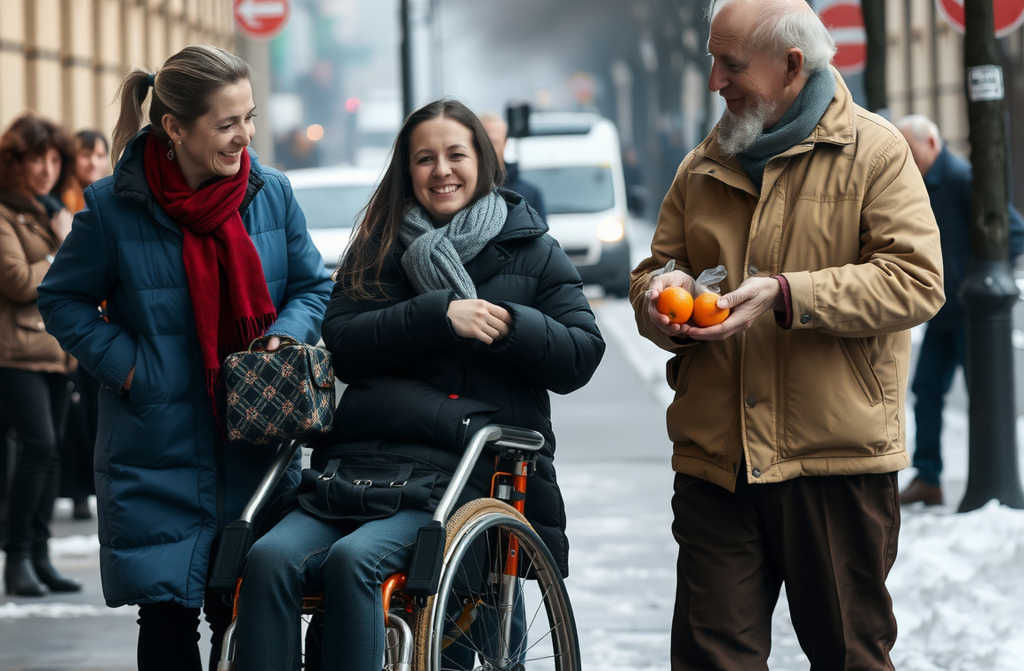 Девица-летящая на встречу с жизнью обгоняет Елену, сбавляет скорость, заметив коляску Артёма. Тот спокойно сидит, сложив ладони на коленях, и не суетится понимает, что сейчас доставит маме только неудобства, если попытается крутить холодные колёса своей инвалидной коляски.