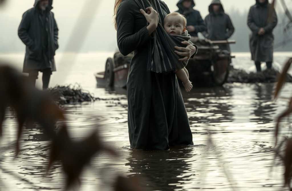 [Широкий план. Молодая женщина ступает в студёную воду Волги, прижимая к себе ребёнка в платке-слинге. На берегу, укрывшись под вязами, стоят сельчане. Один из стариков кричит так, что, кажется, догнать может и по воде.]
