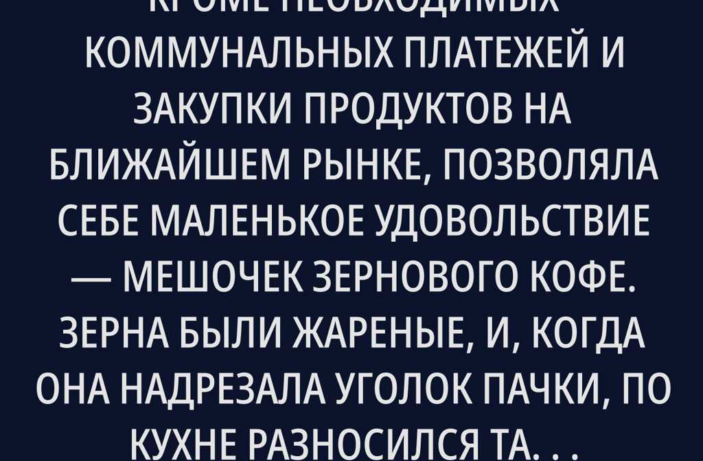 С пенсии Мария Николаевна, кроме необходимых коммунальных платежей и закупки продуктов на ближайшем рынке, позволяла себе маленькое удовольствие мешочек зернового кофе. Зерна были жареные, и, когда она надрезала уголок пачки, по кухне разносился такой аромат, что кружилась голова. Вдыхать его следовало с закрытыми глазами, отрешившись от всего на свете, и тогда происходило почти колдовство: вместе с чудным запахом в ее тело вливалась сила, юношеские мечты о неизвестных краях вспыхивали в памяти будто шум прибоя Каспия, дождь над Кавказскими хребтами, лесной шелест дремучих сибирских борёв и крики непуганых птиц в степи…