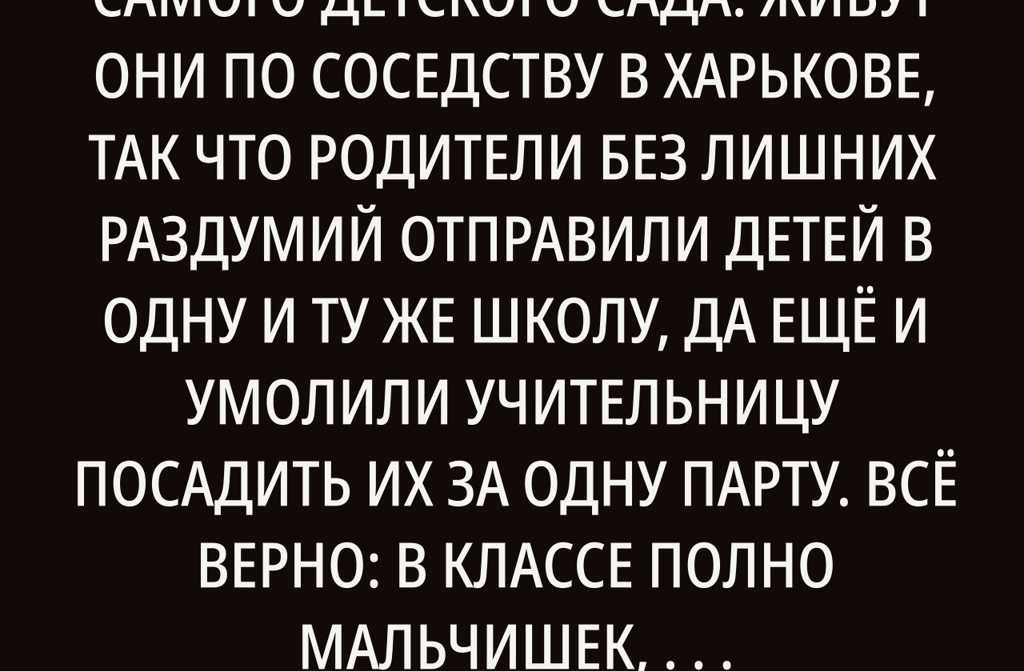 Иван и Ярослава дружат с самого детского сада. Живут они по соседству в Харькове, так что родители без лишних раздумий отправили детей в одну и ту же школу, да ещё и умолили учительницу посадить их за одну парту. Всё верно: в классе полно мальчишек, а Иван мог бы защитить Ярославу, если кто-то начнёт вредничать. Дети ходили в школу с радостью учёба давалась легко и не казалась чем-то устрашающим.