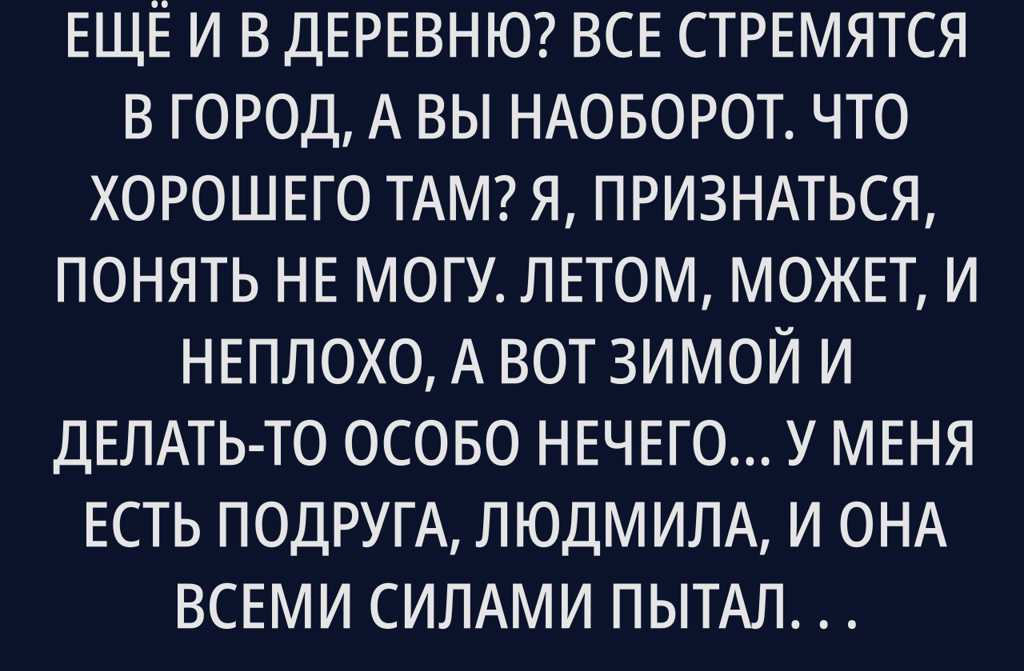 Зачем вам это переезд? Да ещё и в деревню? Все стремятся в город, а вы наоборот. Что хорошего там? Я, признаться, понять не могу. Летом, может, и неплохо, а вот зимой и делать-то особо нечего