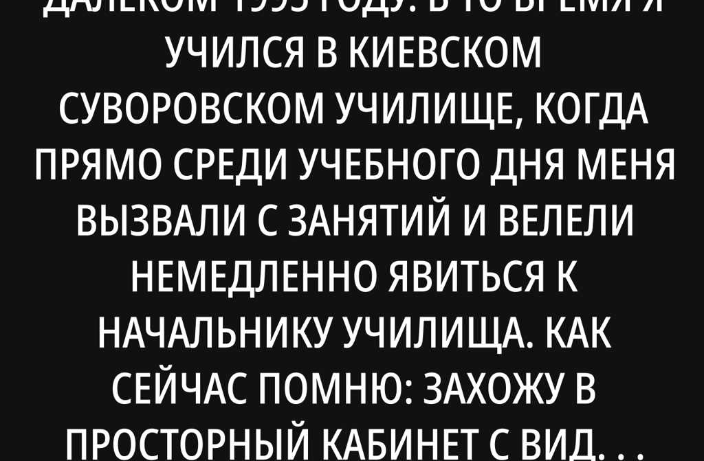 Этот случай произошёл в далёком 1995 году. В то время я учился в Киевском Суворовском училище, когда прямо среди учебного дня меня вызвали с занятий и велели немедленно явиться к начальнику училища. Как сейчас помню: захожу в просторный кабинет с видом на Днепр, а там сидит женщина лицо заплаканное, в руках платок, слёзы катятся по щекам одна за другой.