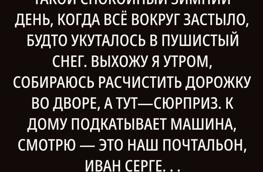 Знаешь, был у меня недавно такой спокойный зимний день, когда всё вокруг застыло, будто укуталось в пушистый снег. Выхожу я утром, собираюсь расчистить дорожку во дворе, а тутсюрприз. К дому подкатывает машина, смотрю это наш почтальон, Иван Сергеевич. Он у нас человек известный всегда улыбается, здоровается с каждым и вообще на редкость душевный.