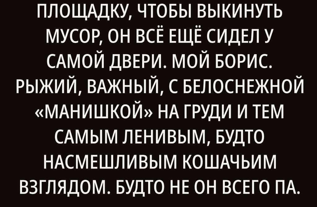 Когда я вышел на лестничную площадку, чтобы выкинуть мусор, он всё ещё сидел у самой двери. Мой Борис. Рыжий, важный, с белоснежной «манишкой» на груди и тем самым ленивым, будто насмешливым кошачьим взглядом. Будто не он всего пару часов назад носился по кухне и с грохотом уронил крышку кастрюли. Я кивнул ему. Он даже ухом не повёл как и положено царю квартиры.