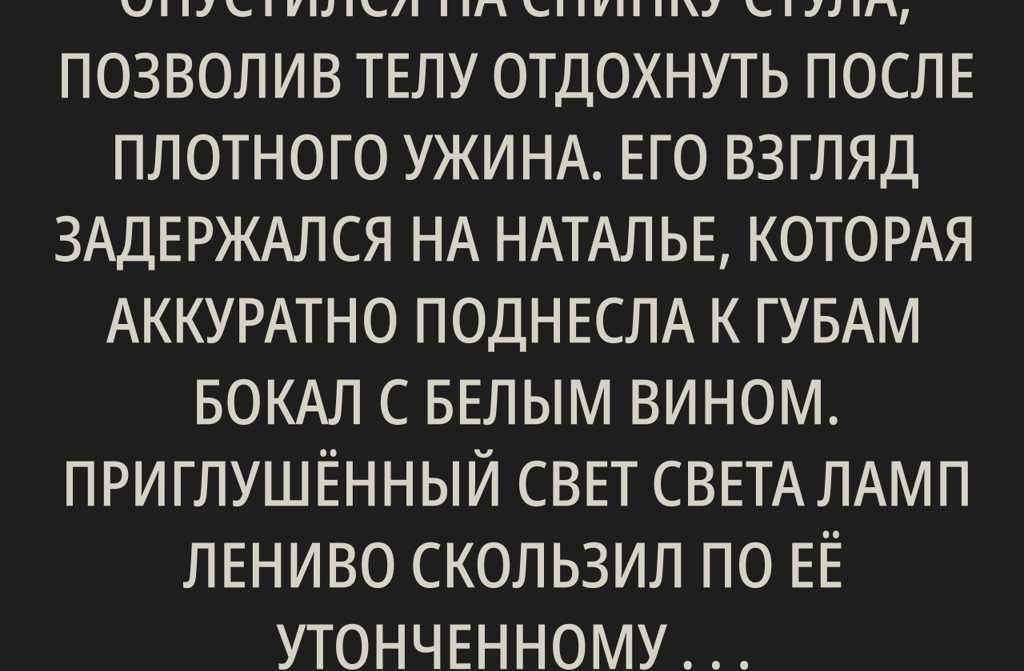 Руслан опустился на спинку стула, позволив телу отдохнуть после плотного ужина. Его взгляд задержался на Наталье, которая аккуратно поднесла к губам бокал с белым вином. Приглушённый свет света ламп лениво скользил по её утонченному лицу, подчёркивая нежные черты скулы, тонкий нос, мягкую линию губ. На щеках играл естественный румянец; глаза блестели теплым светом, словно вбирая в себя сияние этих тихих ламп над столом.