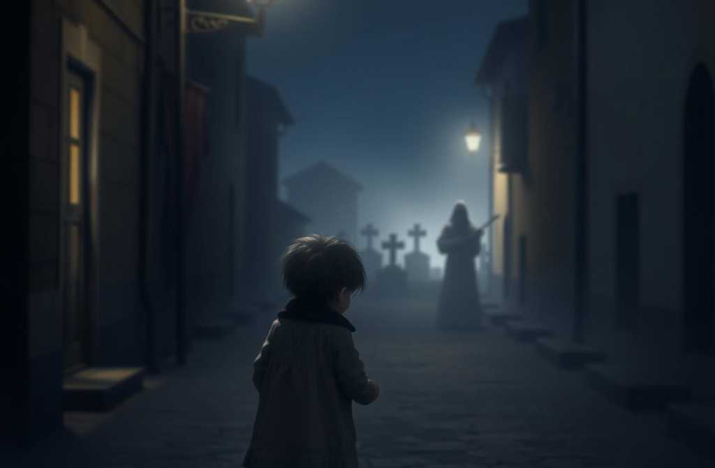 Это случилось на Страстной неделе в прошлом году. Было около восьми вечера, как раз в Великий Четверг. Я шёл по улице, где горел лишь один фонарь. Всё вокруг тонуло во тьме. Вдалеке я заметил огромную тень. Это было нечто иное, чем человек — она не шла, а словно скользила, не издавая ни звука, не меняя очертаний.