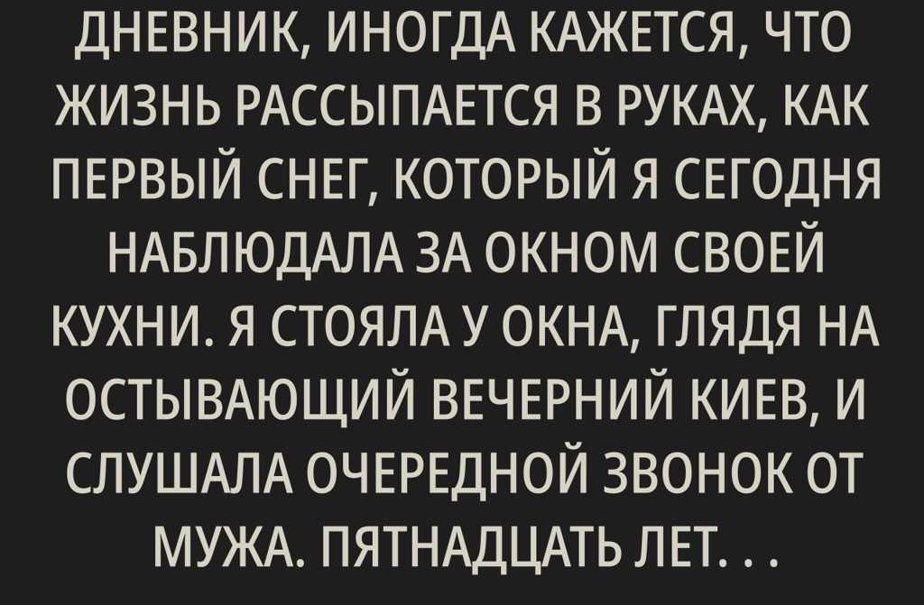 Знаешь, дневник, иногда кажется, что жизнь рассыпается в руках, как первый снег, который я сегодня наблюдала за окном своей кухни. Я стояла у окна, глядя на остывающий вечерний Киев, и слушала очередной звонок от мужа. Пятнадцать лет одного и того же короткие разговоры, извинения, что задержится на работе. На этот раз снова командировка во Львове. Юра уверял, что всё идёт хорошо, встречи приносят пользу, вернётся послезавтра. Голос у него был ровный, спокойный.