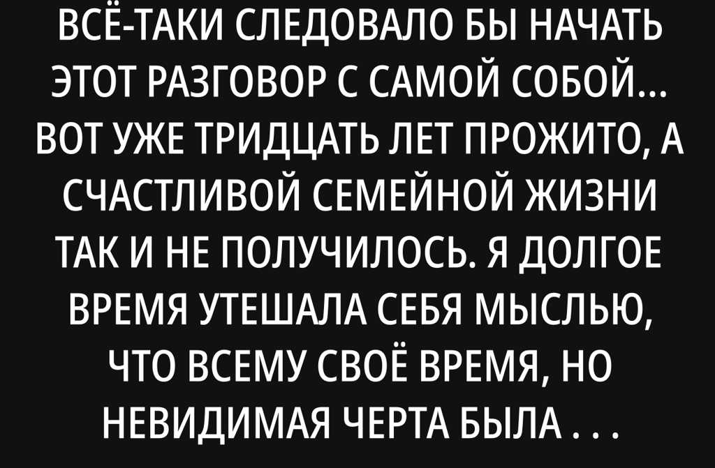 Когда-нибудь всё-таки следовало бы начать этот разговор с самой собой… Вот уже тридцать лет прожито, а счастливой семейной жизни так и не получилось. Я долгое время утешала себя мыслью, что всему своё время, но невидимая черта была перейдена незаметно. Так и осталась одна среди подруг-замужних и однокурсниц, занятых своими заботами и детьми. Поздно, конечно, но я решила, что хватит жить ожиданиями, надо пробовать что-то менять.
