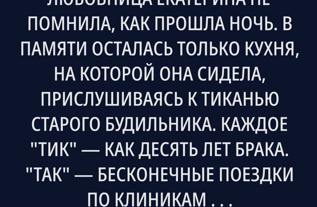 Екатерина не помнила, как прошла ночь. В памяти осталась только кухня, на которой она сидела, прислушиваясь к тиканью старого будильника. Каждое «тик» как десять лет брака. «Так» бесконечные поездки по клиникам Киева. «Так» уколы, анализы и надежды, которые каждый раз исчезали бесследно, будто в воздухе.
