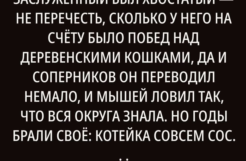 У бабы Дарьи в селе помер кот. Заслуженный был хвостатый не перечесть, сколько у него на счёту было побед над деревенскими кошками, да и соперников он переводил немало, и мышей ловил так, что вся округа знала. Но годы брали своё: котейка совсем состарился, не мудрено, ведь прожил он почти два десятка лет без серьёзной болячки.