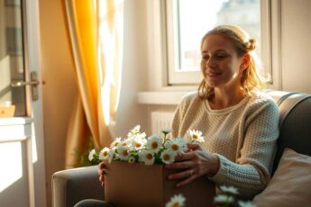 Дверной звонок. На пороге — Андрей с ромашками, Нина в просторном платье, рука на животе.