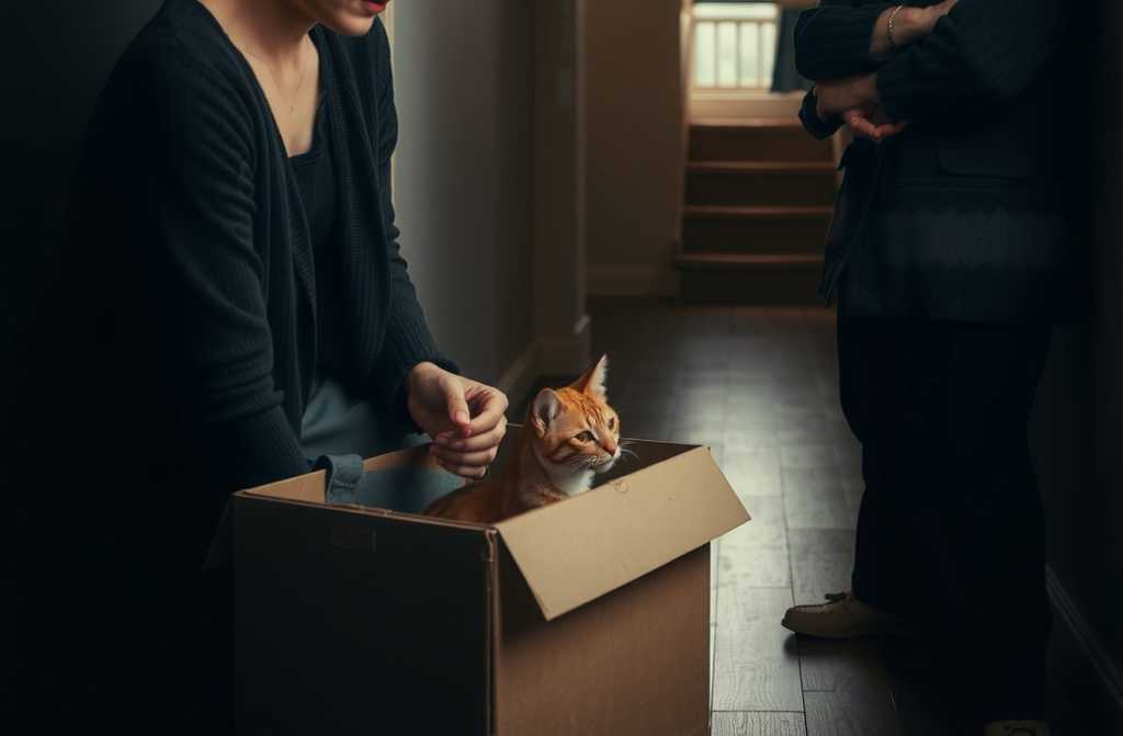 Марина зашла в подъезд и у своей двери увидела коробку. Женщина удивлённо смотрела на неё. Внутри, свернувшись калачиком, лежали собака и кот. Они испуганно следили за Мариной и дрожали от волнения.
