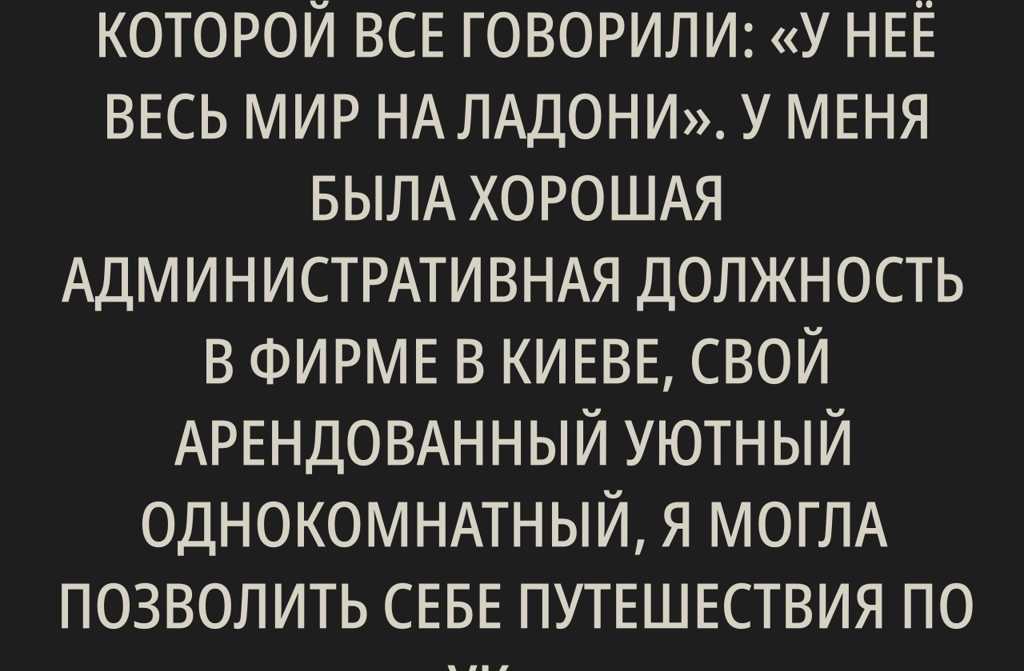 У меня была хорошая административная должность в фирме в Киеве, свой арендованный уютный однокомнатный, я могла позволить себе путешествия по Украине и за границу, встречалась по выходным с подругамигуляли по набережной Днепра, ходили в театр, в кафе или просто танцевали до утра.