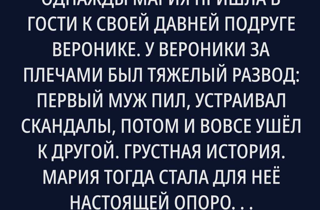 Как сейчас помню, как однажды Мария пришла в гости к своей давней подруге Веронике. У Вероники за плечами был тяжелый развод: первый муж пил, устраивал скандалы, потом и вовсе ушёл к другой. Грустная история. Мария тогда стала для неё настоящей опорой помогала, как могла, поддерживала добрым словом, старалась утешить Для того ведь и необходима дружба, не так ли?