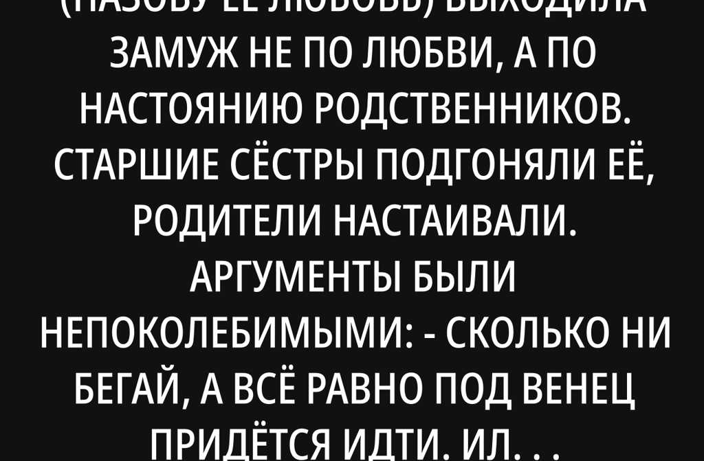 Моя родная тётя (назову её Любовь) выходила замуж не по любви, а по настоянию родственников. Старшие сёстры подгоняли её, родители настаивали.