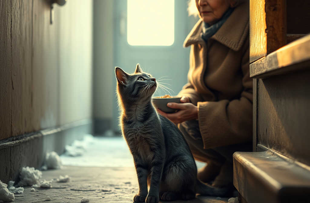 Кот, проскользнувший в подъезд вместе с жильцом, прижался к батарее на лестничной площадке, едва дыша. Шерсть его обледенела, а в глазах читалась мольба и усталость.