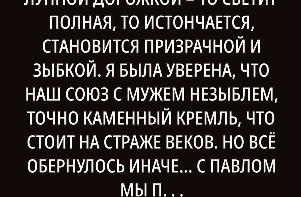 Жизнь моя всегда казалась мне лунной дорожкой то светит полная, то истончается, становится призрачной и зыбкой. Я была уверена, что наш союз с мужем незыблем, точно каменный Кремль, что стоит на страже веков. Но всё обернулось иначе