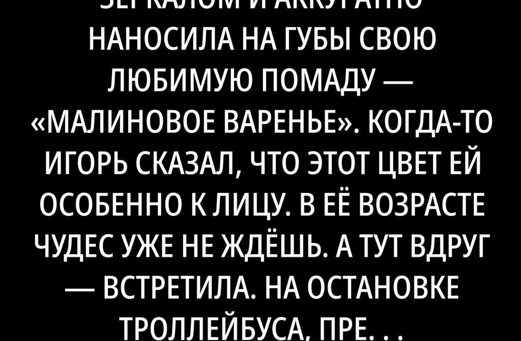 В её возрасте чудес уже не ждёшь. А тут вдруг встретила. На остановке троллейбуса, представьте! Он уступил ей место на лавочке, они разговорились слово за слово, как будто и не видели раньше друг друга.