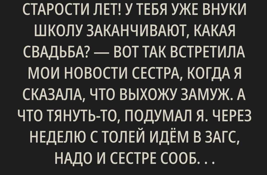 — Людка, ты что, совсем с ума сошла в свои годы? У тебя же внуки в школу ходят, какая ещё свадьба? —…