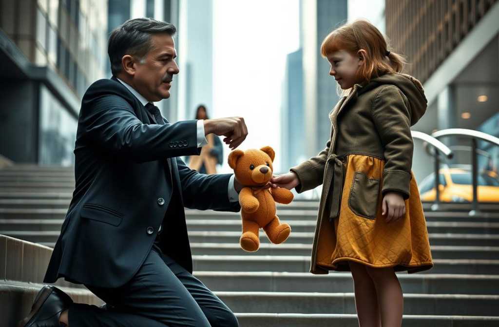Там, у подножия небоскрёба, сидела маленькая девочка. Лет шести-семи. На ней было простое выцветшее жёлтое платьице, колени подтянуты к груди, а под ней тонкое голубое одеяло, аккуратно расстеленное на холодных бетонных ступенях. Перед ней в ряд стояли пять игрушек: потрёпанный плюшевый мишка, пластиковый динозавр, кукла с растрёпанными розовыми волосами и две самодельные фигурки, которые сложно было опознать.