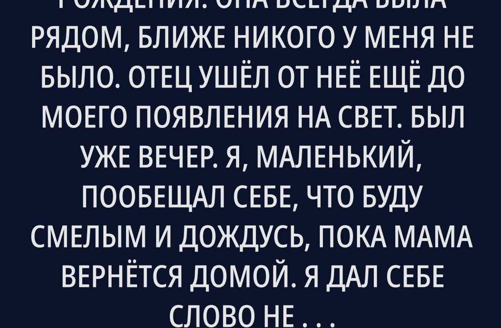 Я знал маму с самого рождения. Она всегда была рядом, ближе никого у меня не было. Отец ушёл от неё ещё до моего появления на свет. Был уже вечер. Я, маленький, пообещал себе, что буду смелым и дождусь, пока мама вернётся домой.
