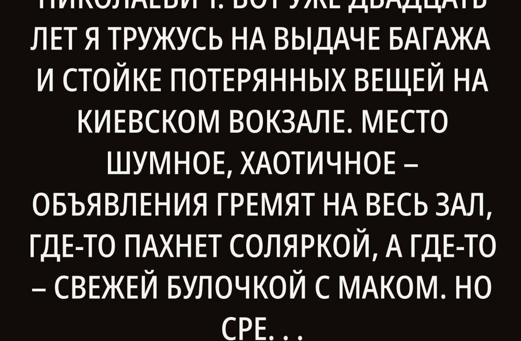 Меня зовут Валерий Николаевич. Вот уже двадцать лет я тружусь на выдаче багажа и стойке потерянных вещей на Киевском вокзале. Место шумное, хаотичное объявления гремят на весь зал, где-то пахнет соляркой, а где-то свежей булочкой с маком.