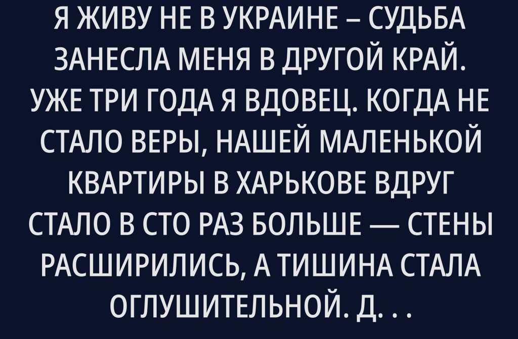 Меня зовут Пётр, мне 61. Сейчас я живу не в Украине судьба занесла меня в другой край. Уже три года я вдовец. Когда не стало Веры, нашей маленькой квартиры в Харькове вдруг стало в сто раз больше стены расширились, а тишина стала оглушительной. Дети разъехались сын в Киеве, дочка в Одессе, у каждого своя жизнь, свои заботы. Звонят по воскресеньям, на Рождество приезжают, а так я и холодильник на диете.