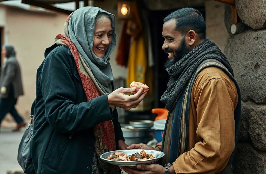 На следующий день Вера тайком положила кусочек жареной колбасы к его блюду и шепнула: «Не рассказывай никому». Марк удивлённо посмотрел на мясо, взял маленький кусок и откусил. Вкус оказался лучшим, что он пробовал за годы.