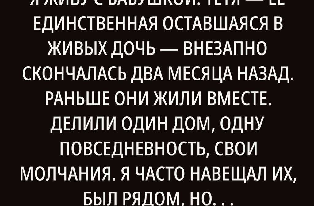 Потеря для меня не нова. Мама умерла, когда мне было 19. С тех пор я привык жить с этой пустотой рядом, как с частью быта. Своего отца я никогда не знал. Нет никаких историй, недосказанностей его просто не было. Потому когда не стало тёти, я чётко понял: осталось только двое я и бабушка.
