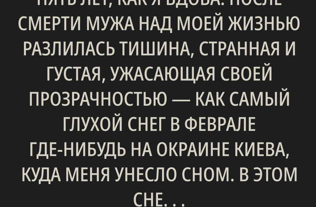 Мне пятьдесят пять, и вот уже пять лет, как я вдова. После смерти мужа над моей жизнью разлилась тишина, странная и густая, ужасающая своей прозрачностью как самый глухой снег в феврале где-нибудь на окраине Киева, куда меня унесло сном. В этом сне я будто впервые смогла признать: мой муж вовсе не был тем «замечательным отцом», о котором годами судачили соседки и даже двоюродная бабушка из Полтавы. Он был человеком, который приносил за́рплату и этим его роль завершалась. Надёжный кормилец, да. Но кормилец и отец не одно и то же. А мне самой приходилось держать на хрупких плечах целую семью, пока он гордо объявлял всем гостям: «Главное, что я обеспечиваю!»