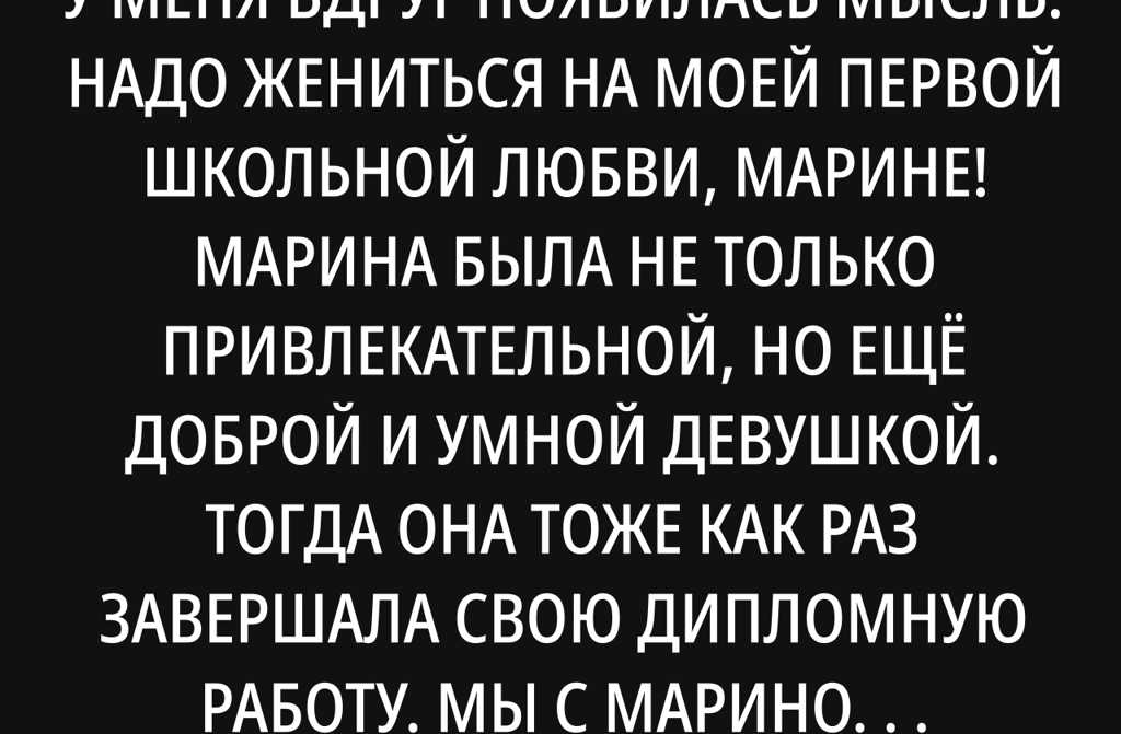 На выпускном из университета у меня вдруг появилась мысль: надо жениться на моей первой школьной любви, Марине! Марина была не только привлекательной, но ещё доброй и умной девушкой. Тогда она тоже как раз завершала свою дипломную работу. Мы с Мариной договорились, что сразу после защиты дипломов поженимся.