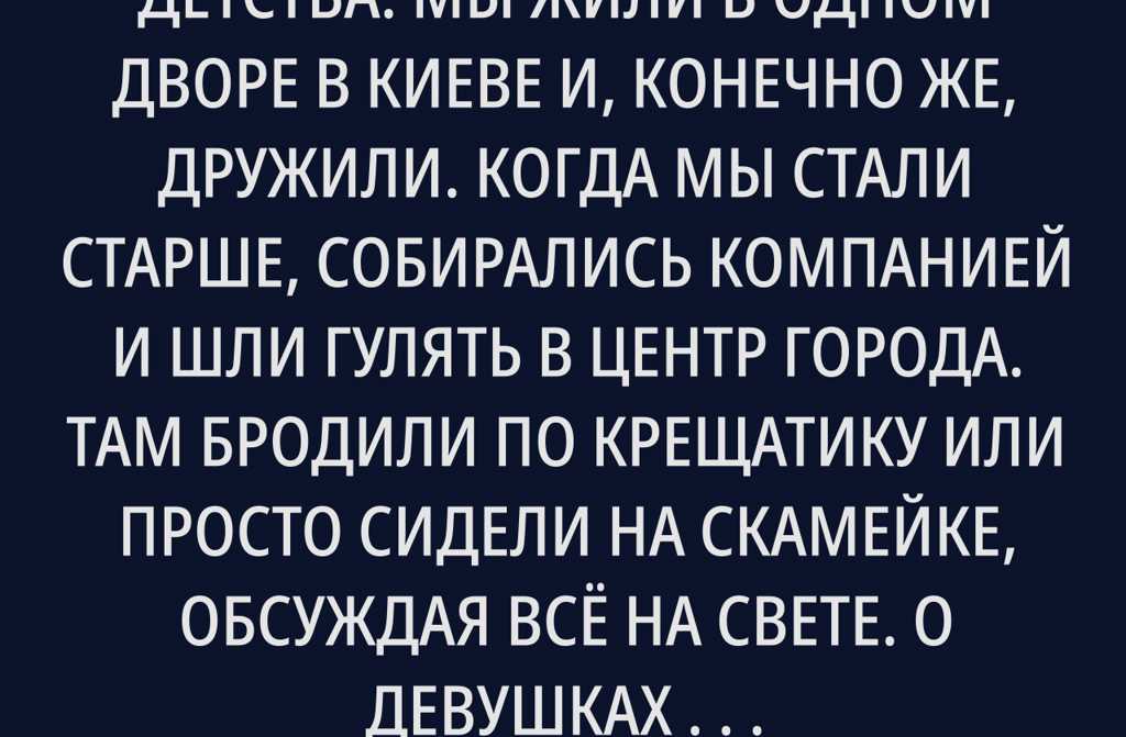 Я знаю Алексея с самого детства. Мы жили в одном дворе в Киеве и, конечно же, дружили. Когда мы стали старше, собирались компанией и шли гулять в центр города. Там бродили по Крещатику или просто сидели на скамейке, обсуждая всё на свете. О девушках тогда думали несерьёзно больше интересовало, что скажут ребята, не хотелось ударить в грязь лицом перед друзьями.