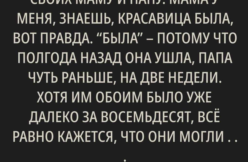 Слушай, расскажу тебе про своих маму и папу. Мама у меня, знаешь, красавица была, вот правда. Была потому что полгода назад она ушла, папа чуть раньше, на две недели. Хотя им обоим было уже далеко за восемьдесят, всё равно кажется, что они могли бы прожить больше Ну, потому что это же мой папа и моя мама.
