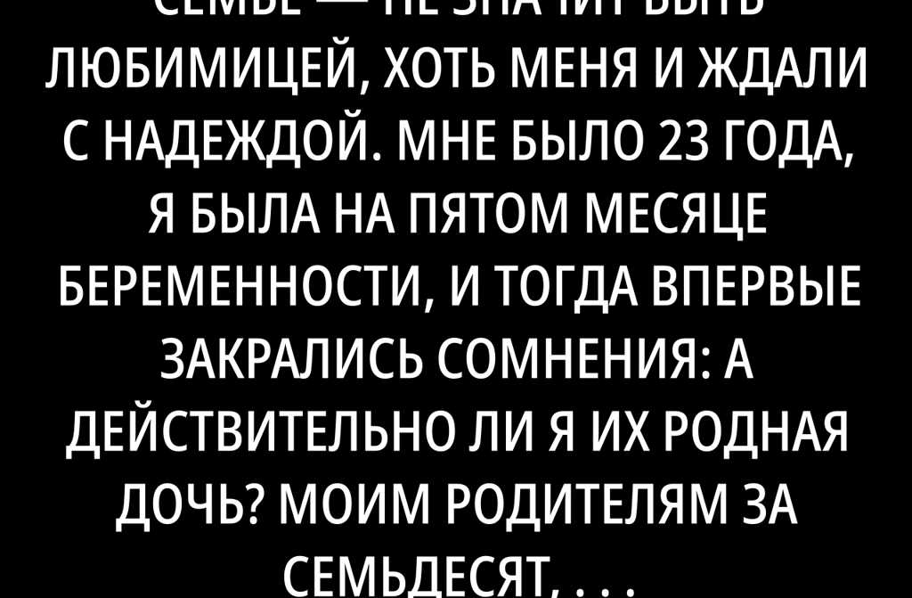 Быть единственным ребёнком в семье не значит быть любимицей, хоть меня и ждали с надеждой. Мне было 23 года, я была на пятом месяце беременности, и тогда впервые закрались сомнения: а действительно ли я их родная дочь? Моим родителям за семьдесят, и у нас с ними постоянные финансовые трудности. Мы живём с мужем в съёмной квартире в центре Киева, денег хватает едва-едва. Мы оба учимся и подрабатываем, но всё равно не можем покрыть все расходы. Уже дважды нам угрожали выселением за неуплату, пришлось занимать у знакомыхдолги растут, еды порой не хватает, постоянно чувствуем себя на волоске от беды. Иногда мама приносит нам какую-нибудь еду, спасая в самой нужде.