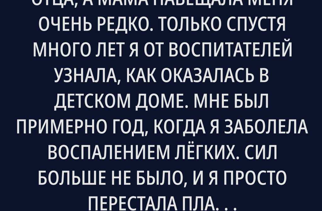 Я никогда не видела своего отца, а мама навещала меня очень редко. Только спустя много лет я от воспитателей узнала, как оказалась в детском доме. Мне был примерно год, когда я заболела воспалением лёгких. Сил больше не было, и я просто перестала плакать. Несколько дней тихо лежала в кроватке, постепенно затухая, а маме в это время было только до рюмки она горевала и пила водку на кухне.