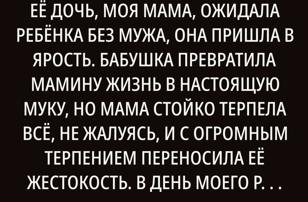 Когда моя бабушка узнала, что её дочь, моя мама, ожидала ребёнка без мужа, она пришла в ярость. Бабушка превратила мамину жизнь в настоящую муку, но мама стойко терпела всё, не жалуясь, и с огромным терпением переносила её жестокость.
