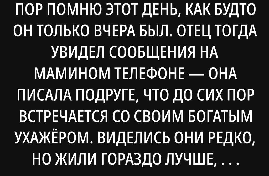 Мне было пять лет, но я до сих пор помню этот день, как будто он только вчера был. Отец тогда увидел сообщения на мамином телефоне она писала подруге, что до сих пор встречается со своим богатым ухажёром. Виделись они редко, но жили гораздо лучше, чем на папину зарплату. Папа тогда зарабатывал вообще копейки, и ему приходилось покупать вещи, которые нам особо-то и не были нужны, просто чтобы мама не переживала. Ещё и упрёки потом: «Как ты вообще посмел залезть в мой телефон?», орала мама, пользуясь старой хитростью: нападение лучшая защита. Мол, на твои деньги тут ничего не купишь, чем, по-твоему, дом полон продуктов? Да этот телевизор мой! кричал отец. Да он и твой тоже! Конечно, отвечал он, и твой, и телевизор, и мясо и Гена тоже. Я всё заберу с собой. Я тогда испугался. Если раньше я был где-то в стороне от их ссор, то теперь стал прямым участником так сказать.