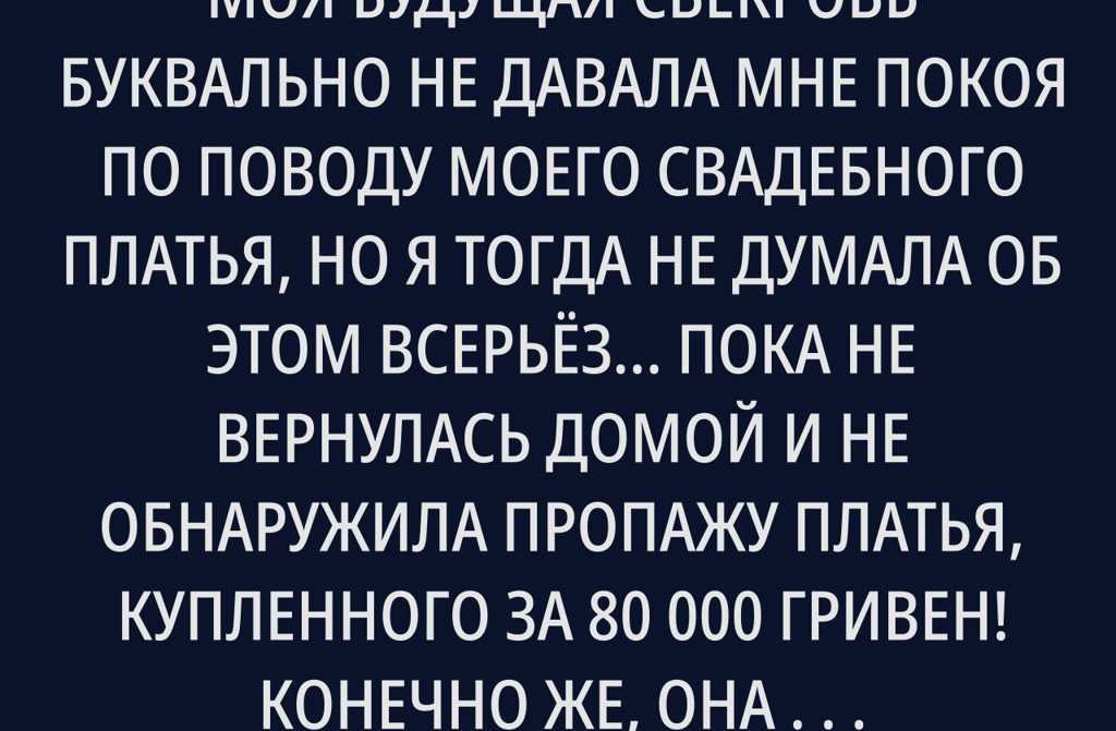 Помню, как однажды давно моя будущая свекровь буквально не давала мне покоя по поводу моего свадебного платья, но я тогда не думала об этом всерьёз пока не вернулась домой и не обнаружила пропажу платья, купленного за 80 000 гривен! Конечно же, она его примерила, испортила и даже не захотела возместить ущерб. Я была в ярости и на грани отчаяния, но на мое счастье, у меня оказалось секретное оружие, которое всё изменило.