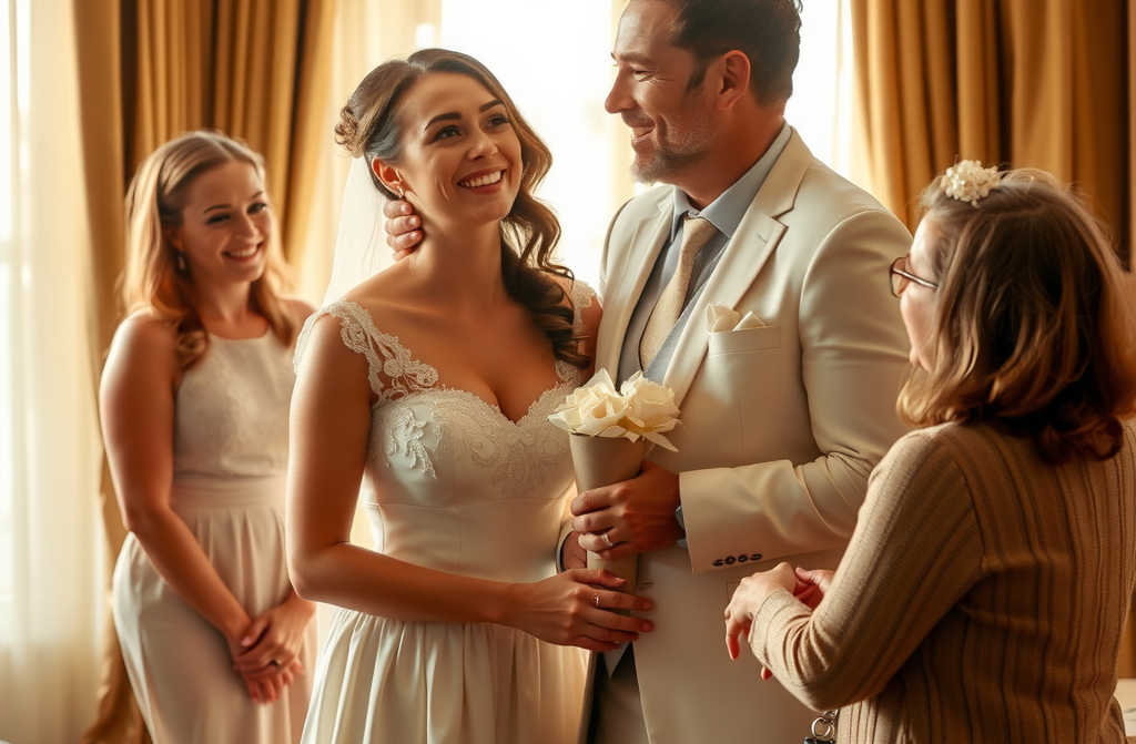 В день свадьбы Марии и Алексея погода была прекрасной, несмотря на дождливые прогнозы утром. Мария блистала в шикарном шелковом платье с тонким кружевом. Алексей не мог отвести взгляд от своей невесты весь день. Свадьба получилась по-настоящему радостной. Фотограф работал с усердием щёлкал зеркалкой без остановки, гости с нетерпением ждали банкета.