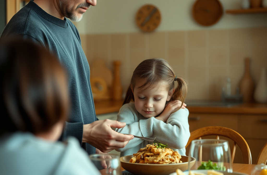 Она смотрела на блюдо как на что-то незнакомое. Не брала ложку. Почти не моргала. Ее плечики сжались, будто она ждала чего-то неприятного.