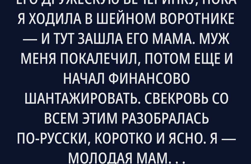 Муж меня покалечил, потом еще и начал финансово шантажировать. Свекровь со всем этим разобралась по-русски, коротко и ясно.