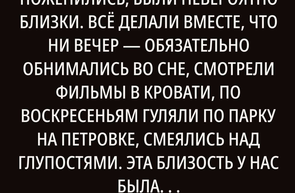 Ты знаешь, когда мы с Игорем поженились, были невероятно близки. Всё делали вместе, что ни вечер обязательно обнимались во сне, смотрели фильмы в кровати, по воскресеньям гуляли по парку на Петровке, смеялись над глупостями. Эта близость у нас была очень живая не по расписанию, а как-то по-настоящему, как получалось. Я себя рядом с ним чувствовала любимой и нужной.