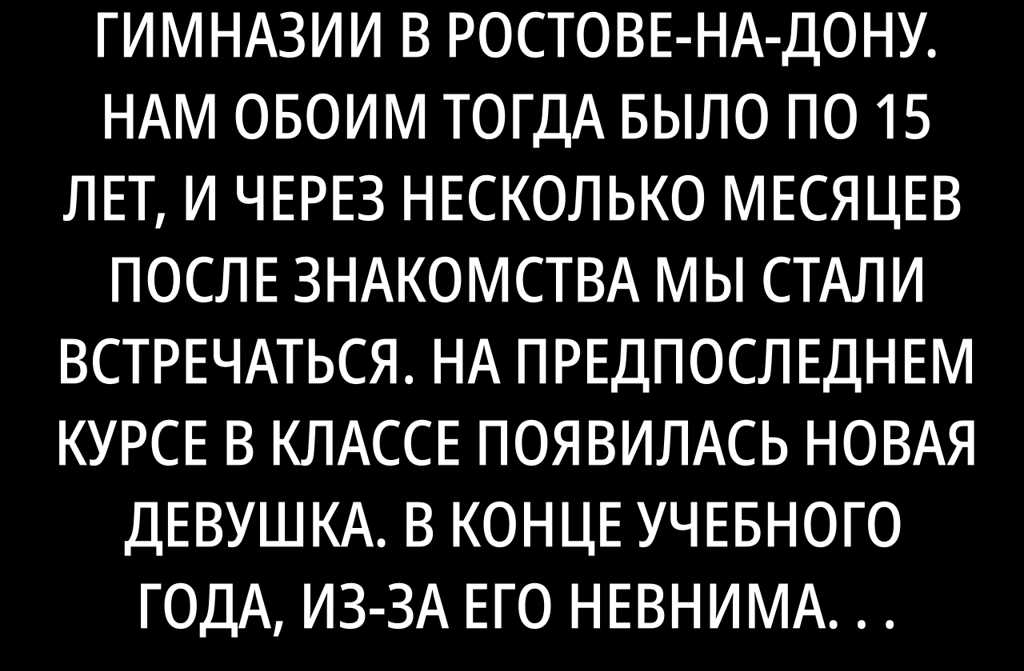 Я познакомилась с ним ещё в гимназии в Ростове-на-Дону. Нам обоим тогда было по 15 лет, и через несколько месяцев после знакомства мы стали встречаться. На предпоследнем курсе в классе появилась новая девушка. В конце учебного года, из-за его невнимательности, он забыл свой телефон, и я увидела переписку с ней. В тот момент у меня многое в голове прояснилось: когда ей было плохо, она всё время бежала к нему за поддержкой, а я считала, что у них просто дружба.