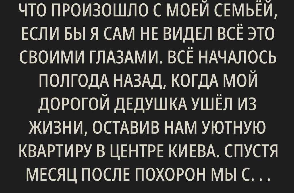 Было бы трудно поверить в то, что произошло с моей семьёй, если бы я сам не видел всё это своими глазами. Всё началось полгода назад, когда мой дорогой дедушка ушёл из жизни, оставив нам уютную квартиру в центре Киева. Спустя месяц после похорон мы с семьёй решили привести квартиру в порядок и подготовить её к продаже. Днём мы складывали вещи дедушки в большие мешки, стараясь быть аккуратными.