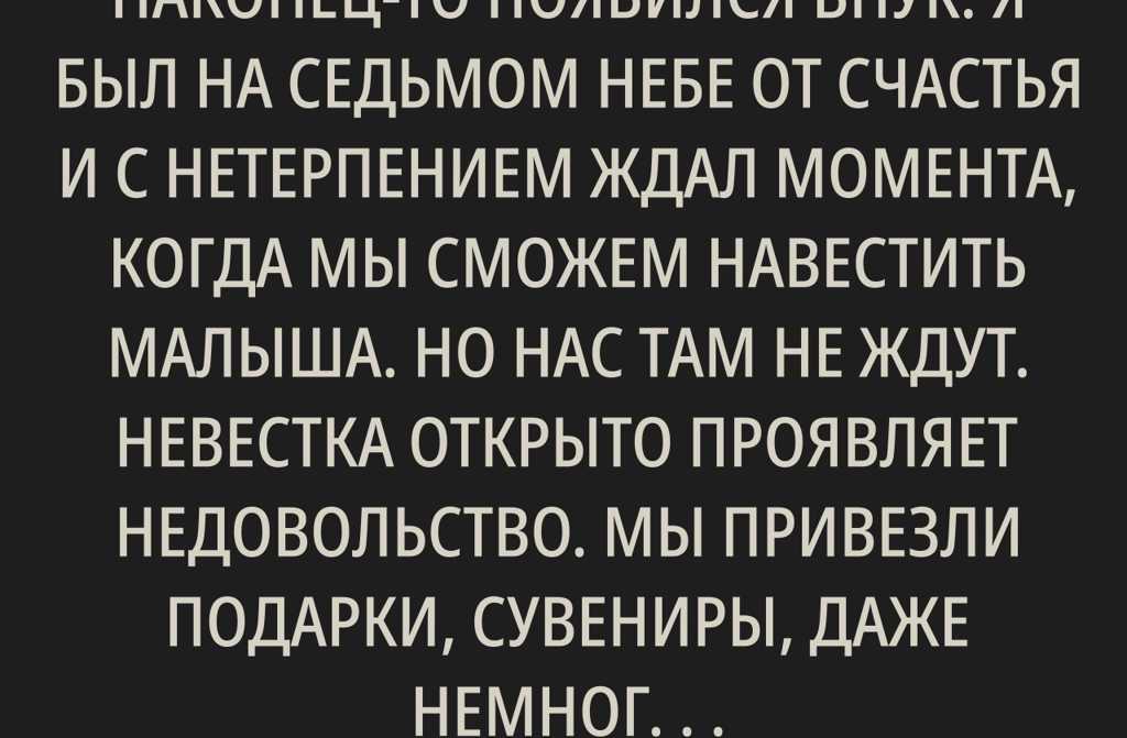 В прошлом месяце у меня наконец-то появился внук. Я был на седьмом небе от счастья и с нетерпением ждал момента, когда мы сможем навестить малыша. Но нас там не ждут. Невестка открыто проявляет недовольство. Мы привезли подарки, сувениры, даже немного гривен дали, а она всё равно встревожена при нашем появлении. То же самое касается и моей сестры.