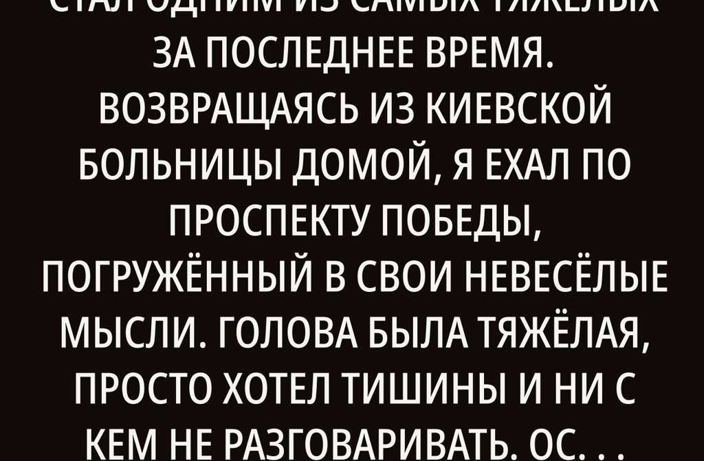 Сегодняшний день для меня стал одним из самых тяжёлых за последнее время. Возвращаясь из киевской больницы домой, я ехал по проспекту Победы, погружённый в свои невесёлые мысли. Голова была тяжёлая, просто хотел тишины и ни с кем не разговаривать. Остановился на светофоре недалеко от Крещатика, когда вдруг взгляд выхватил знакомую фигуру среди толпы.